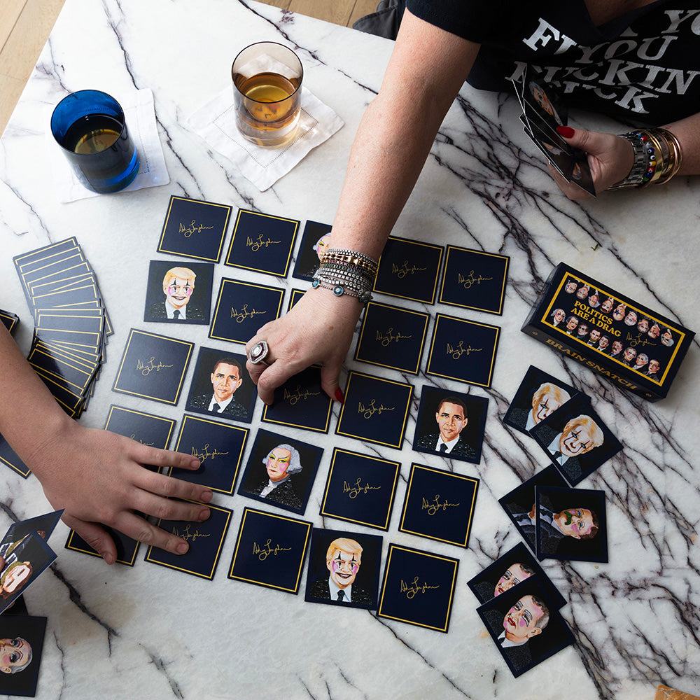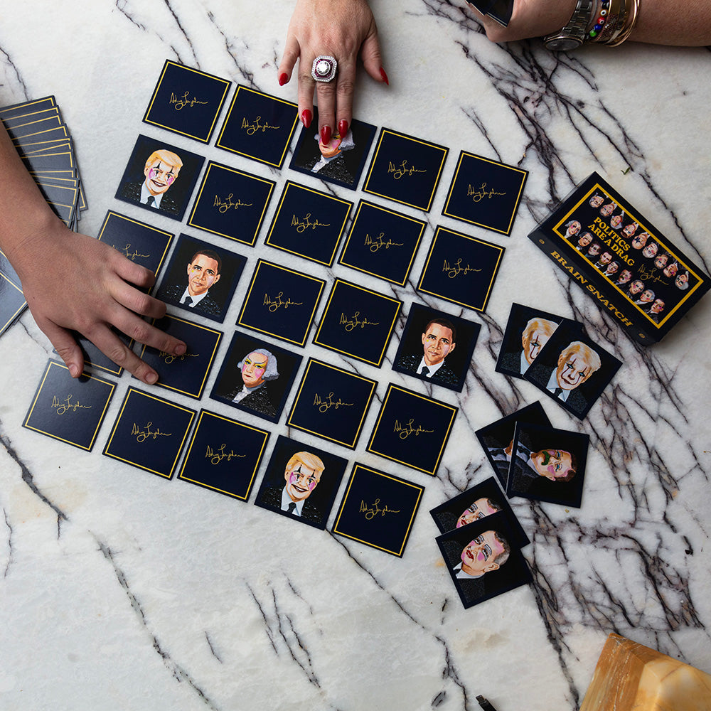 Time to match wits and wigs with my Politics Are a Drag edition of Brain Snatch. Featuring U.S. presidents reimagined in full drag makeup from my "Politics Are a Drag" series. This limited-edition collectible pairs art, humor, and a sharp memory. Play it just like the Memory Game.. lay um out and match um up!! YAY!!!