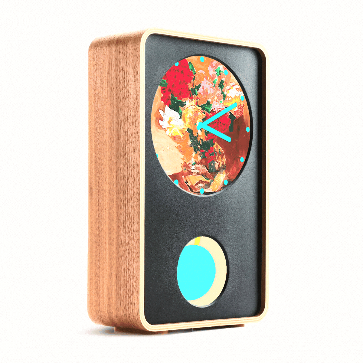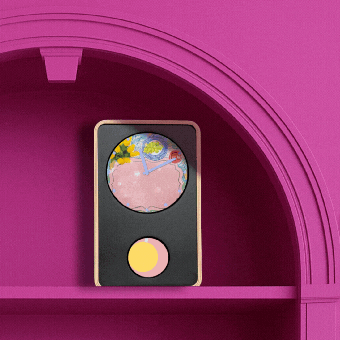 • Ashley Longshore x KlydoClock digital clock with exclusive Ashley Longshore animated artwork on a magenta colored shelf.