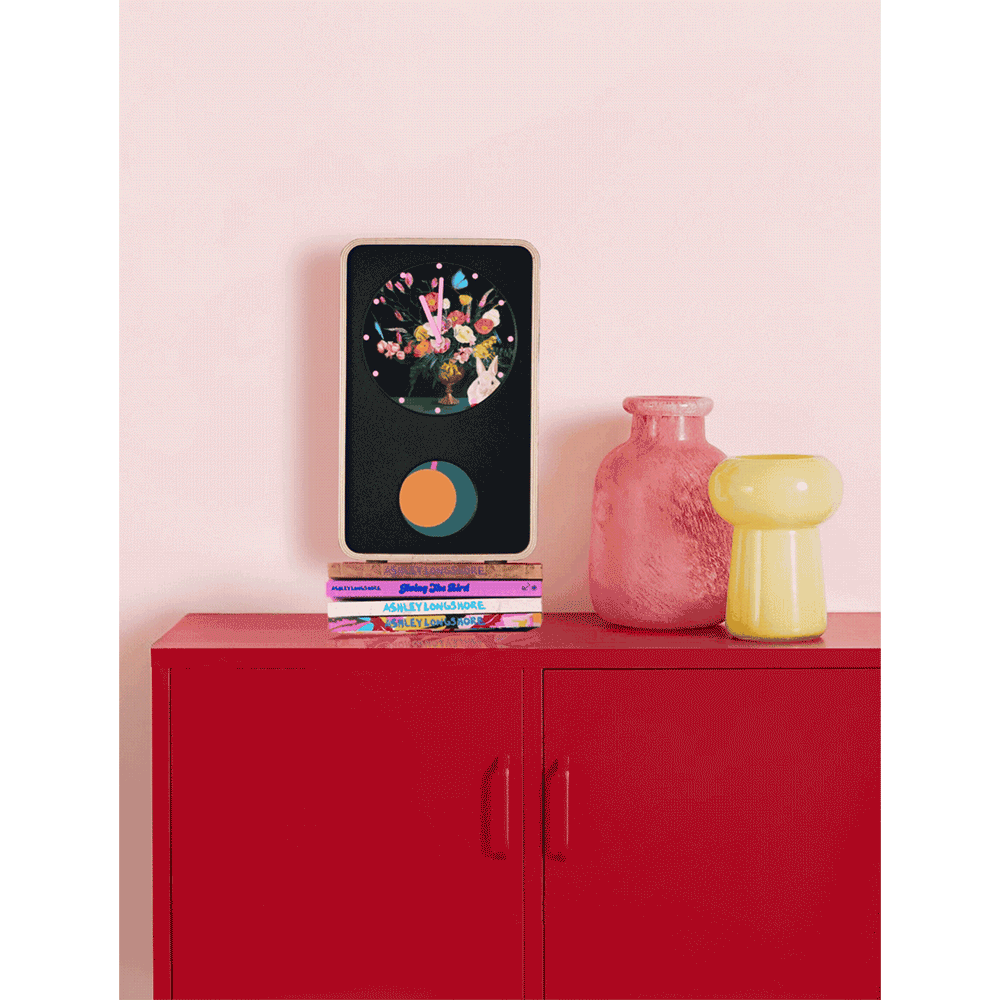 • Ashley Longshore x KlydoClock digital clock with exclusive Ashley Longshore animated artwork on a red cabinet and a stack of Ashley Longshore books.