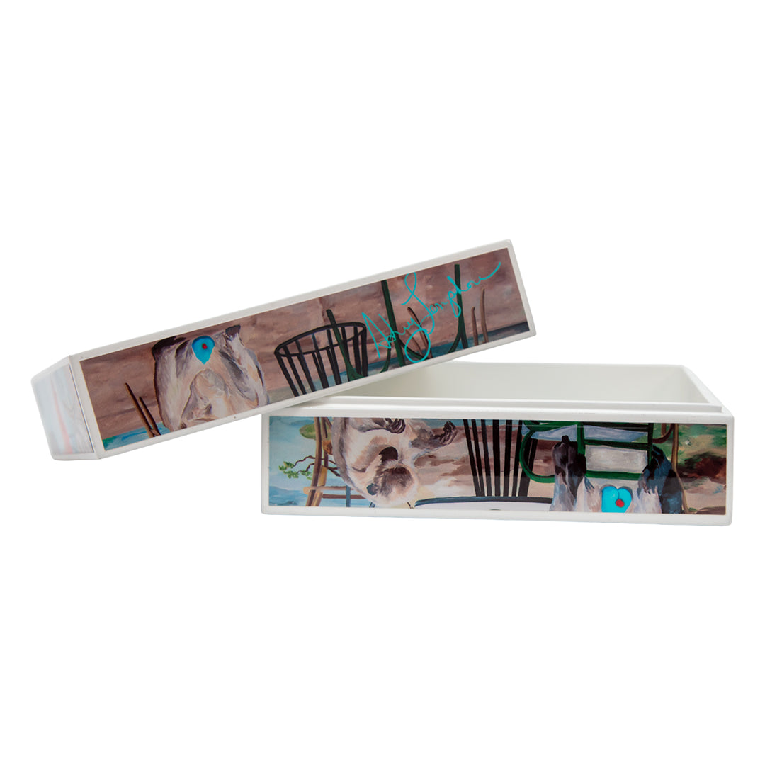 This glossy lacquer box is a pure daydream — vervet monkeys flaunting their turquoise jewels, a flamingo strutting through the scene, and a red chandelier dripping in jewels. Use it to stash your secrets, love letters, or just your favorite vibrator. Hand-finished to a mirror shine, it’s a slice of surreal paradise — a meeting of jungle mischief and high-society.