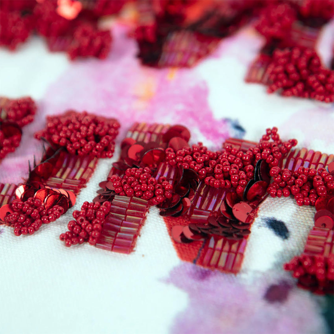*One size fits most... 100% linen with hand-beaded details. Tie-neck & tie-wait with tassels. Ashley Longshore Signature Loop Tag. Dry clean only.
